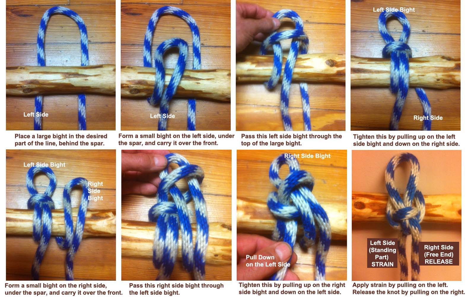 The following photos illustrate the draw hitch being tied starting from the left and ending on the right, i.e. the part of the line that will be holding the strain is on the left, and the part of the line that will be pulled to release the rope is on the right. The draw hitch can be tied just as easily proceeding from right to left. Click on the photos for a larger view: