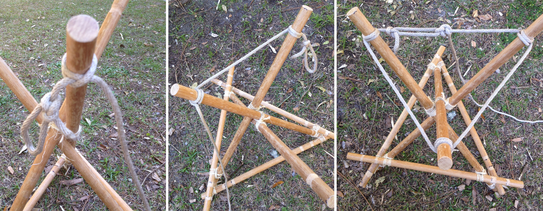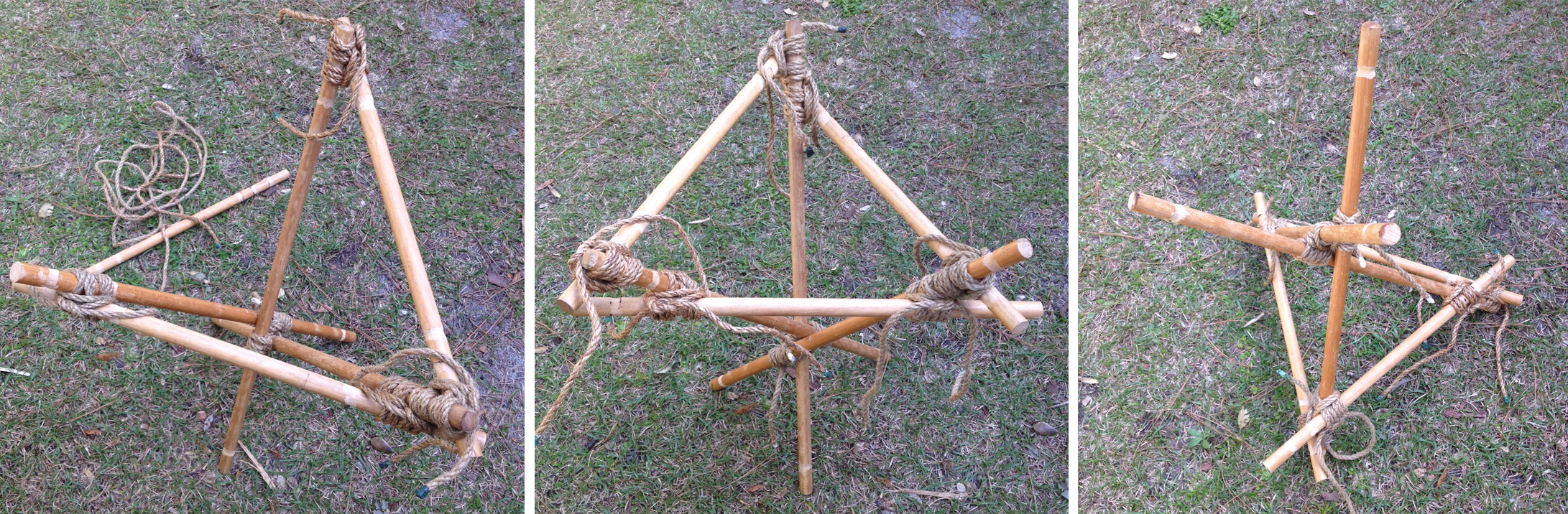Prepare the sticks: Since it’s so important to have everything even, before lashing can begin, points where the sticks will meet should be marked out. If the materials will be used repeatedly, it will be practical to mark out a complete series of points on every stick so that each can be used interchangeably.