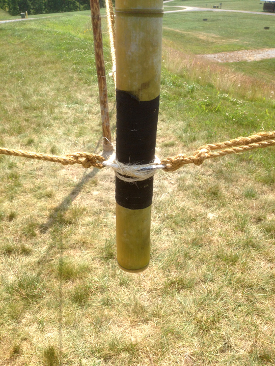 - The guylines from each upright support pole are tied to corresponding loops in the jury mast knots at the top and bottom of the flagpole with two half hitches, the tail of which is tightly seized to the standing part using binder twine with a West Country Round Lashing.