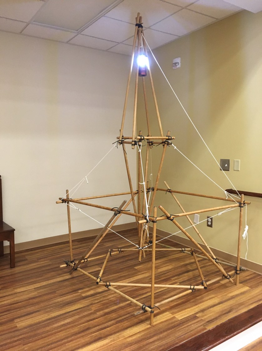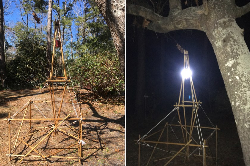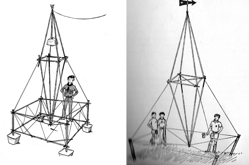 This design was adapted from what John Sweet refers to as The Skylite in his booklet Pioneering in Town and Country. The main difference is the improvised framework for the two narrow quadpods is neither anchored or reliant on weighted supports, but instead is wide enough to allow the whole structure to be free-standing all by itself. With today’s lightweight LED lanterns, it’s easy to rig a halyard to raise and lower the lantern so it can be easily turned on and off. The novelty of floating the quadpods off the ground, like the Skylon “Floating” Flagpole adds and element of coolness to the structure as well as a little additional height for the beacon.