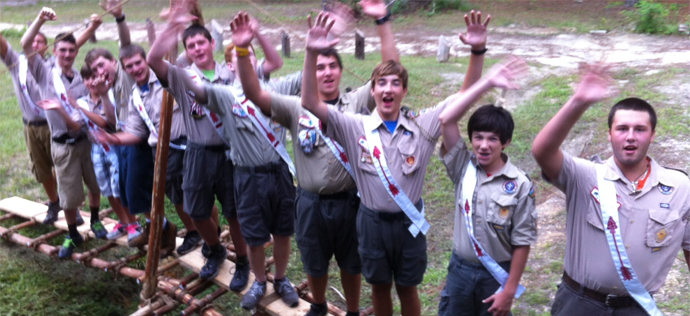 Previous Image Next Image Link to: Single A-Frame Bridge Scouts wave from a Single A-Frame Bridge built by the Pioneering Merit Badge Class during OA Week at Camp Coker. Like Loading...