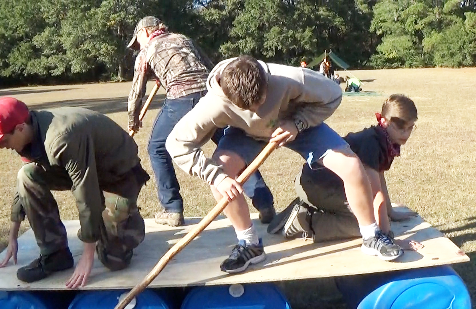 Boy Scout Troop 888 builds a seesaw as an attraction at a District Webeloree.