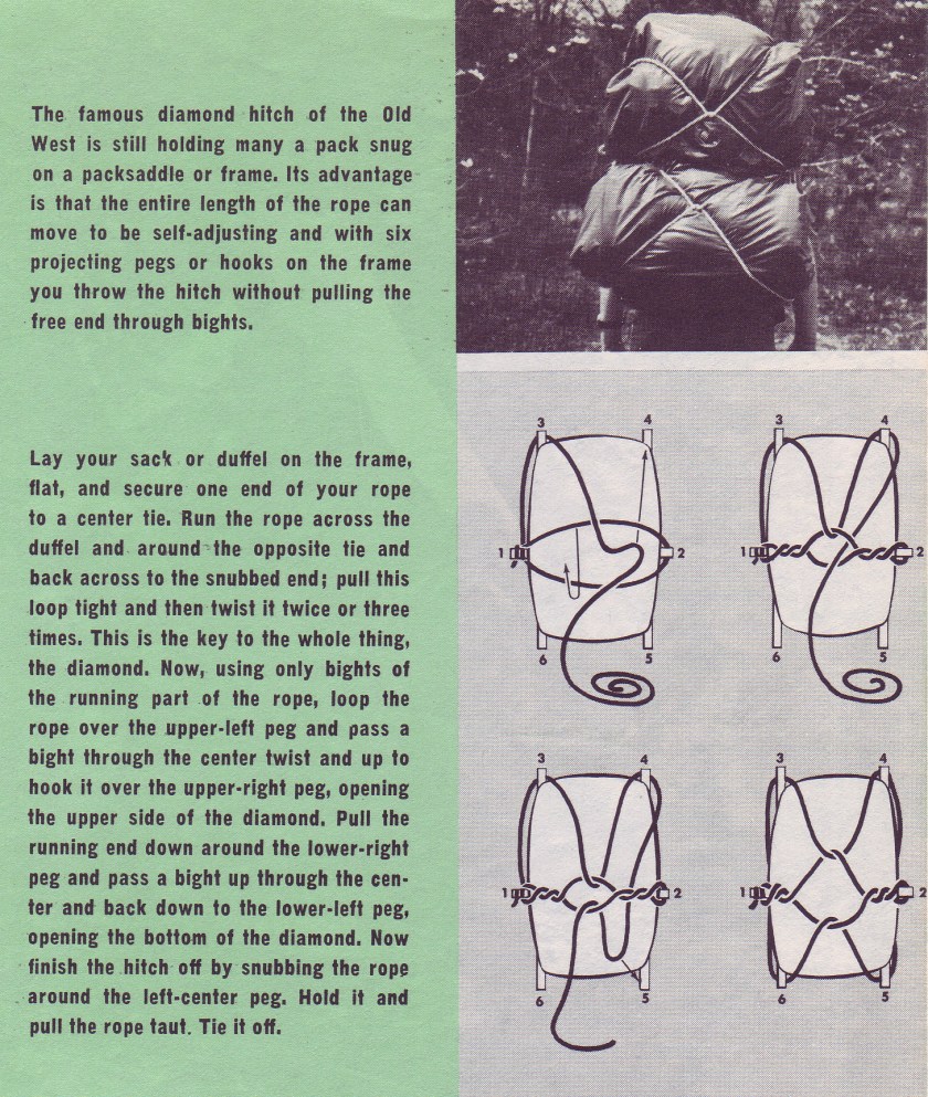 The Diamond Hitch was many times more prevalent a couple of decades past, and was featured throughout a range of Scout publications. It’s not actually associated with Scout Pioneering, but it’s still an example of nifty rope work. Though there’s not nearly as many packboards in use today, the Diamond Hitch still can serve as the most practical approach to securing a bundle to an object, even in today’s modern world of bungee cords and the like. The following diagram and description was scanned from the ’76 printing of the 1967 Fieldbook.
