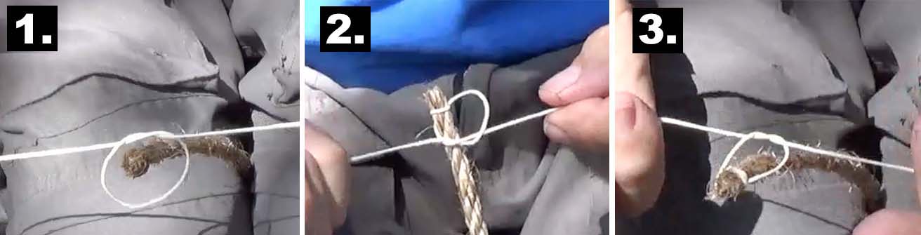 2. Continue by carrying the two ends of the whipping cord around the back of the rope, away from you, and tie another half knot identical to the first.