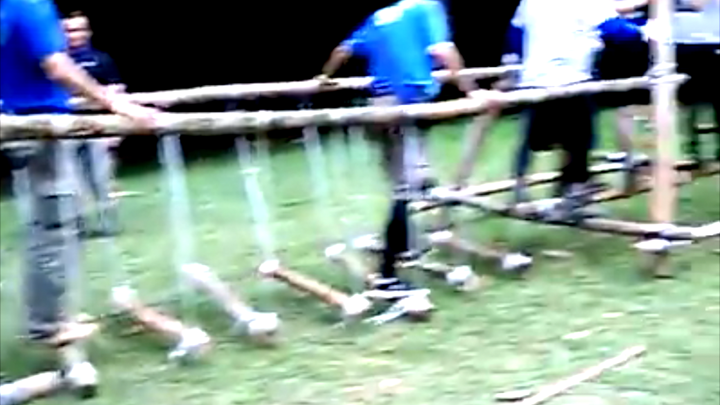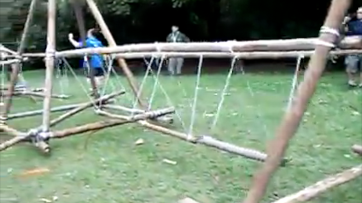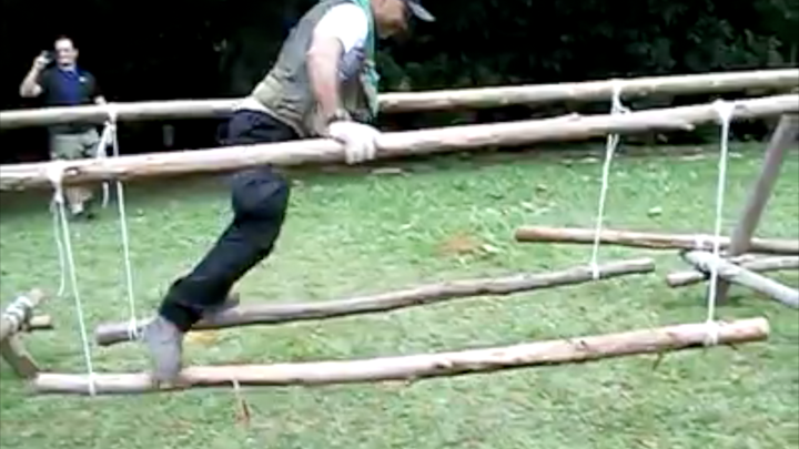 Pioneering projects can be built to serve a practical purpose, as in a bridge connecting two banks of a stream providing a shortcut to the dining hall, or simply for recreation as in a swing boat at a Scout Expo. The most desirable project constructed just for fun is the one that can get a lot of use. The more action it sees, the the more it can be considered a success. The Brazilian Balance Track, so dubbed because it came to our attention in a FaceBook post from the 88º GE / RJ Scout Group Atol das Rocas of Brazil as part of a training given by Chief Jorge Kuma Stotuka, is simply irresistible! Most everyone passing by is going to want to give it a go! For that matter, as revealed in the video, a group of Scouts will literally line up with individual Scouts waiting their turn to get on and see how easy or hard it is to make it from one end to the other.