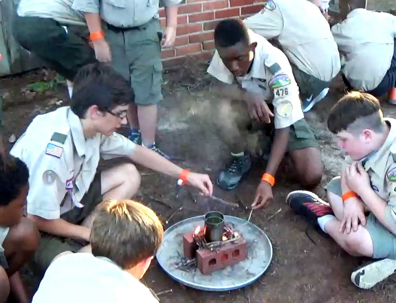 – Method: Before the race, each patrol gathers and organizes native tinder, and kindling for their fire (or is limited to materials provided). Each patrol selects two representatives. On signal, the two Scouts set up their fireplace, light a fire, place the can of water over the fire, and keep feeding the fire until the water boils. Other patrol members help as needed. (Lighting and Feeding a Fire Video)
