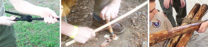 | BASIC KNOTS – Bowline – Clove Hitch – Lark’s Head – Sheepshank – Sheet Bend – Square Knot – Taut-line Hitch – Timber Hitch – Two Half Hitches FIRE BUILDING SKILLS – Lighting and Feeding a Fire – Laying a Fire – After a Fire – Flint and Steel – Bow and Drill NAVIGATION AND MEASUREMENTS – Facing a Bearing – Using a Map – Measuring Heights and Widths LASHINGS – Diagonal Lashing – Filipino Diagonal Lashing – Floor Lashing (Double) – Round Lashing – Shear Lashing – Square Lashing (Mark II) – Tripod Lashing – West Country Round Lashing |