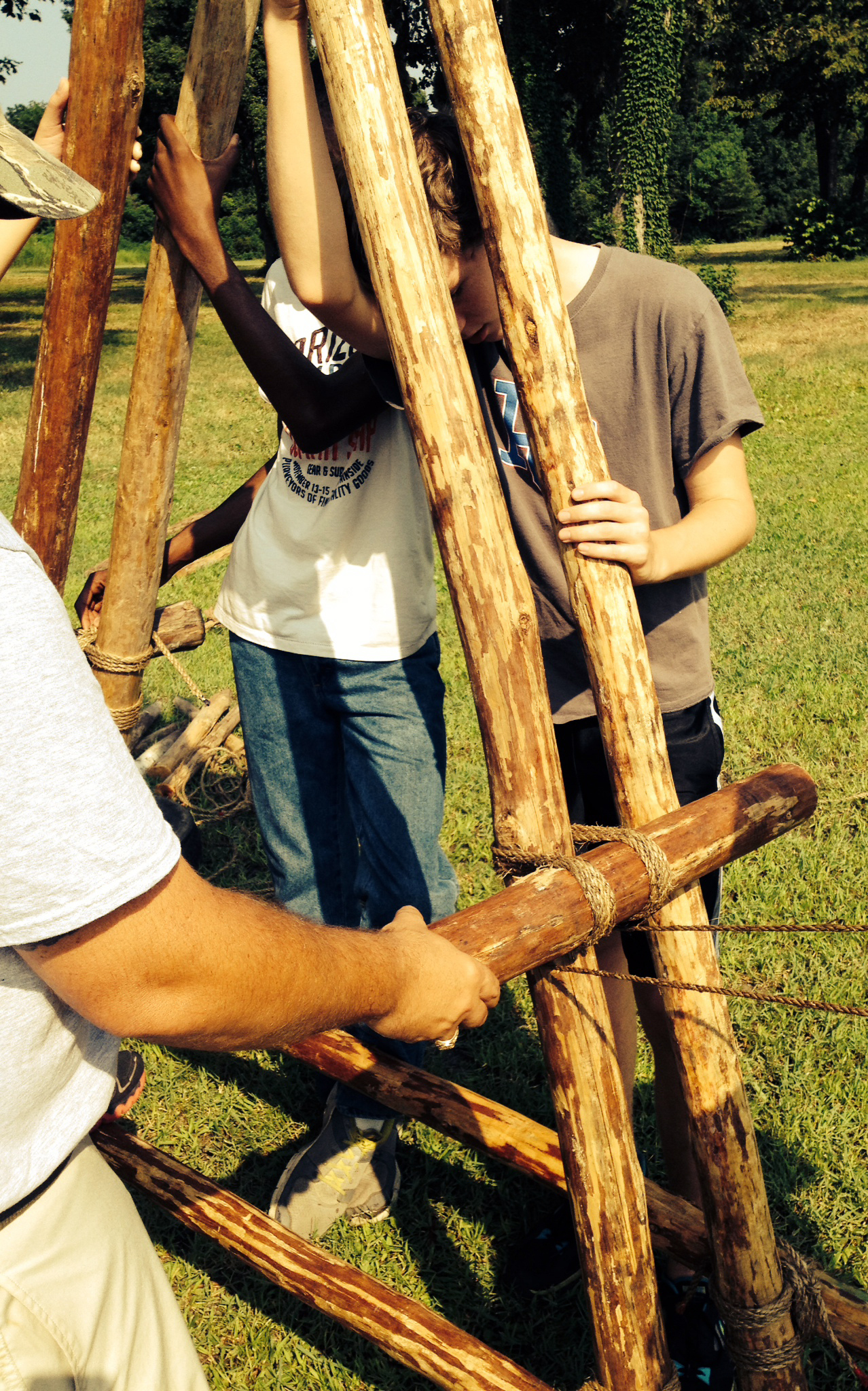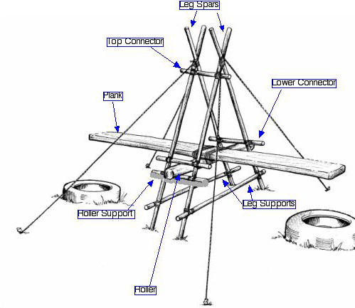 Enter the “Raccoon Patrol”: As part of a troop that regularly embraces large pioneering projects, the Raccoon Patrol is well-versed in building A-frames. During inter-patrol competitions at Scout meetings, they do well in A-frame Chariot Races. On outings they build camp see-saws where the roller bar for the plank is supported by two heavy duty A-frames. They have also helped to build several monkey bridges relying on sturdy A-frames as sub assemblies. Belonging to a unit with a successful pioneering program, they’ve been taught to make their A-frames using three Japanese Mark II Square Lashings. In addition to being supported in certain BSA publications, their grasp of Scouting skills stems from Scouters who’ve served on the pioneering staff at national jamborees and who, themselves, have learned from some of the most esteemed Scout Pioneering legends.