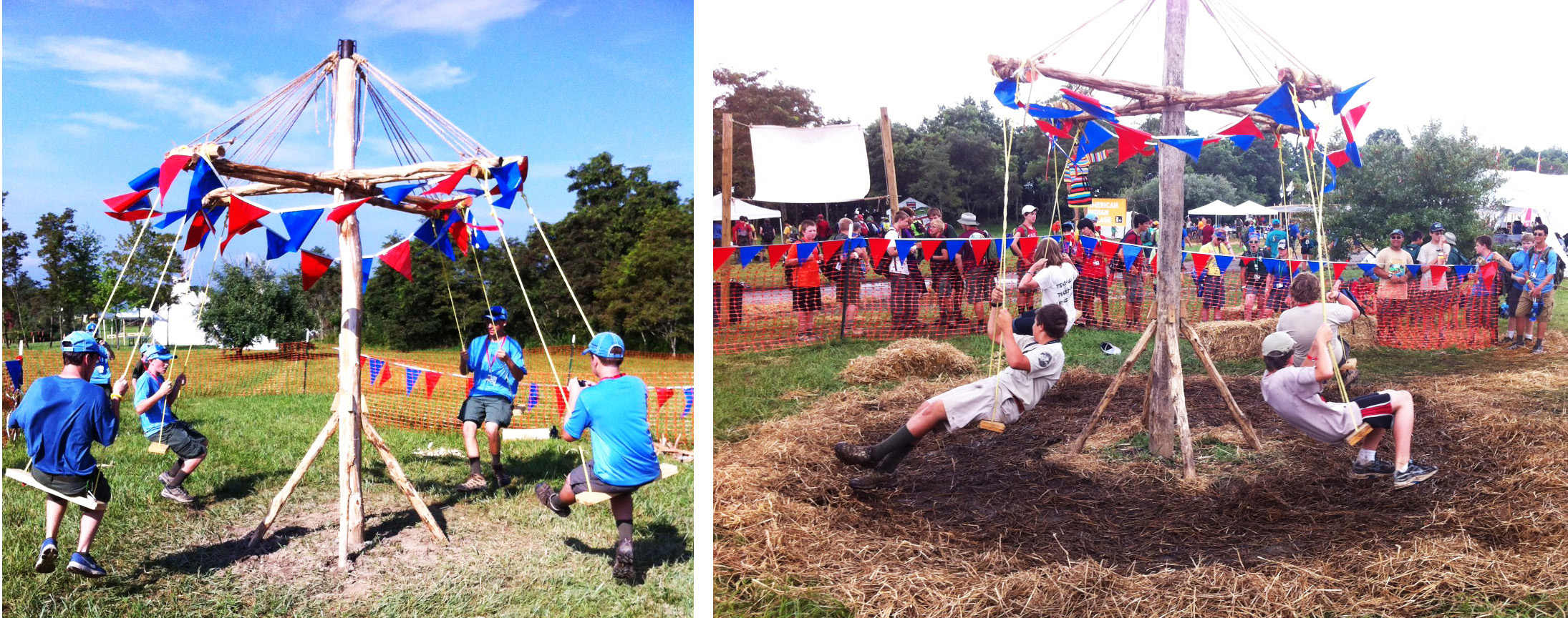 The carousel has been a mainstay for the past several jamborees. It was located at the entrance to Peschke Field just beyond the Indian Village, and was one of the most popular attractions in the pioneering area. Because it was so much fun, there was often a line of Scouts and Venturers waiting their turn to get on board. Notice the transformation of the carousel grounds after days of use and lots of rain. (Click on the photos for full page views.)
