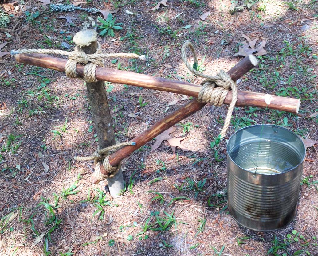 The design for this easy camp gadget is very straightforward. The diagonal support brace forming a triangle is what makes it work, and without it, the notched stick could never securely support the bucket.