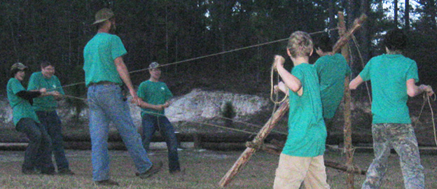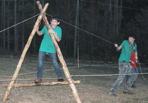 Scout Spirit! This was best exampled during a District Camporee devoted to Junior Leader Training. Scouts from Troop 822 out of Mount Vernon, SC poured themselves into the activity and not only mastered the challenge, but provided spectators with some fun and excitement as well. They approached the task of building their A-Frame with enthusiasm. Finishing in good form, they wasted no time in standing up the structure and holding it in position with their guylines. As soon as their rider climbed on board, it became obvious: it was the top two lines that required the most unfaltering attention to keep the A-Frame vertical. The Scout on the A-Frame was exuberant as he discovered how to swing the walker forward one leg at a time. The patrol then totally got the hang of how to use the bottom guylines to add that real oomph to the “walker” propelling it forward. As they smoothly traversed the fifteen feet of the “alligator pit,” their leader reminded us of a coxswain, rhythmically yelling out, “Pull!” to the crew manning the oars in a boat race. “One, two, THREE!…one two, THREE!…one two, THREE!” On each “THREE!” the rider swung one leg of the “walker” forward, as the Scout manning that leg’s forward guyline simultaneously heaved on his rope, while the others remained alert to help guide and steady the A-Frame. Their “walker” actually walked in rhythm and it was quite a spectacle!