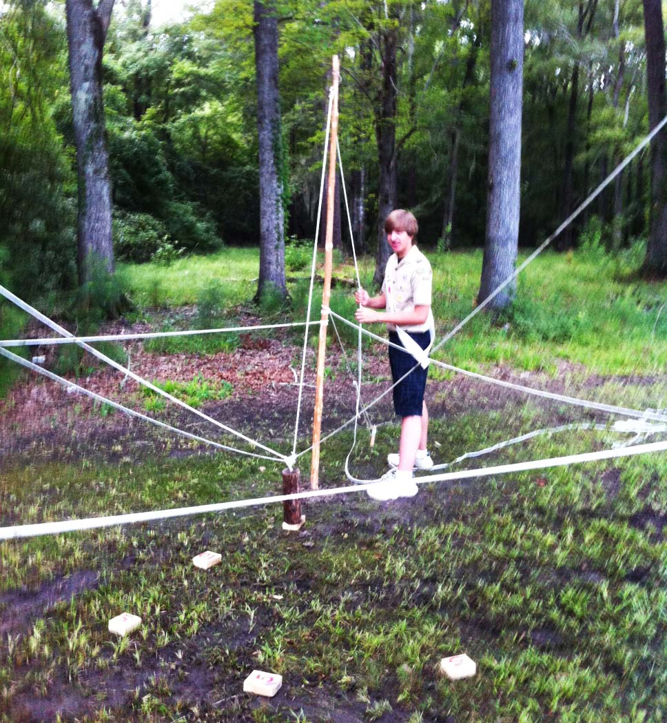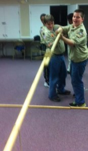 - Scouts man each pulley rope, but instead of facing the square, each must turn their back to the discs. Naturally, in order to maneuver the log from this position, they must rely on an assigned leader to direct their actions.