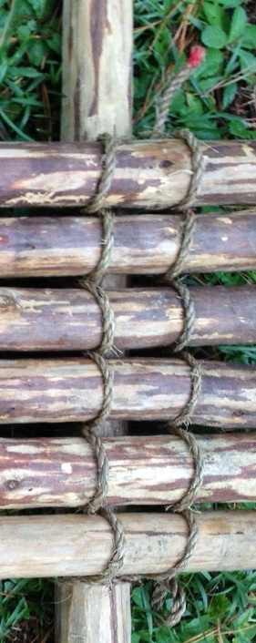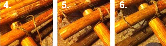 3. Up against the first floor spar, tie one end of the lashing rope to the platform support with a cove hitch, leaving enough “tail” at the end to twist around the long end of the rope before continuing.