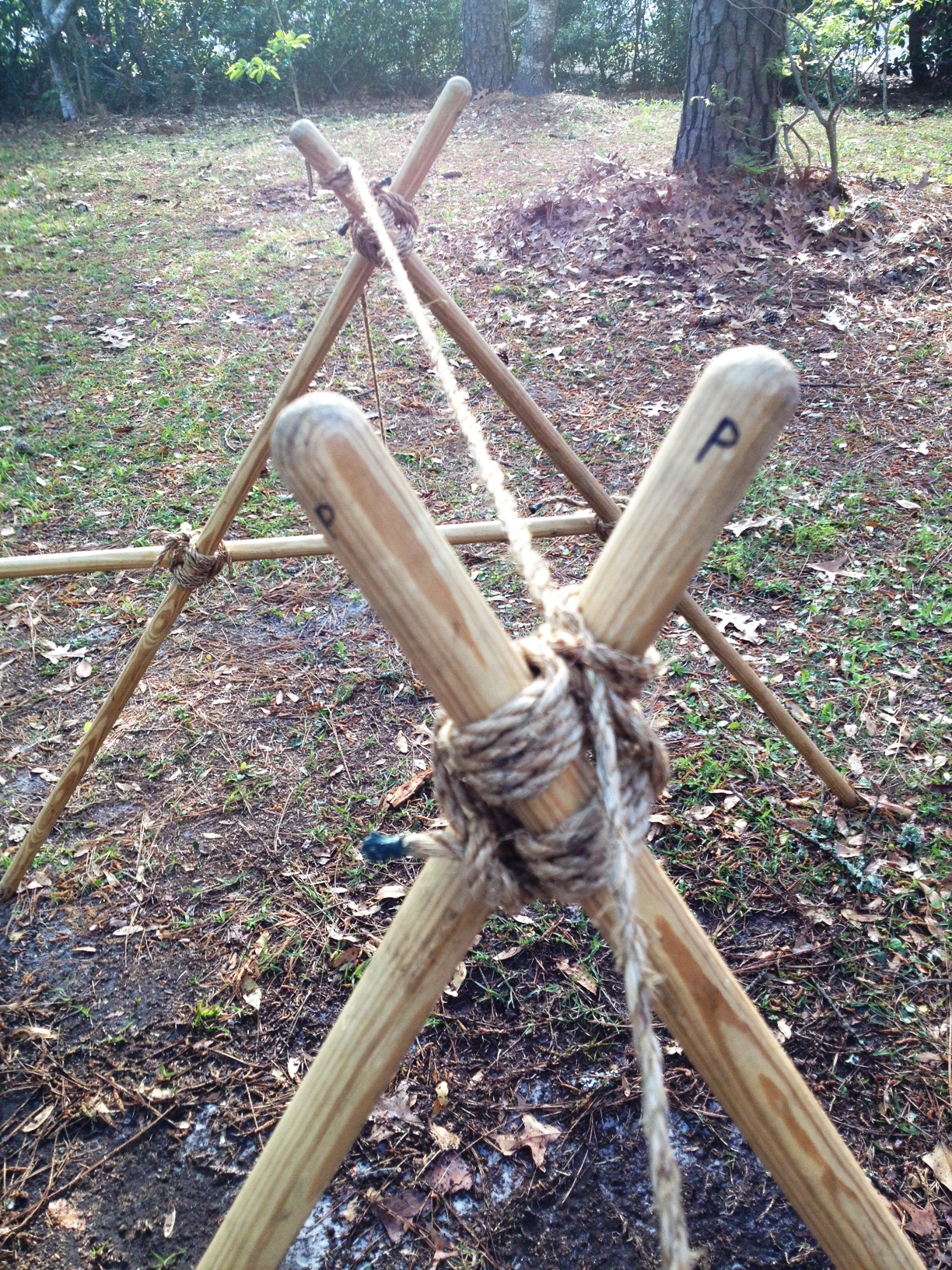 What is a spar? Simply stated, in pioneering, a spar is a thick, strong pole. Obviously, when completed, a pioneering project has to be able to withstand the strain and stress that will occur while performing its intended function. We can’t build a structure out of spindly sticks tied together with string and expect it to work. We use spars lashed together with good, natural fiber rope!