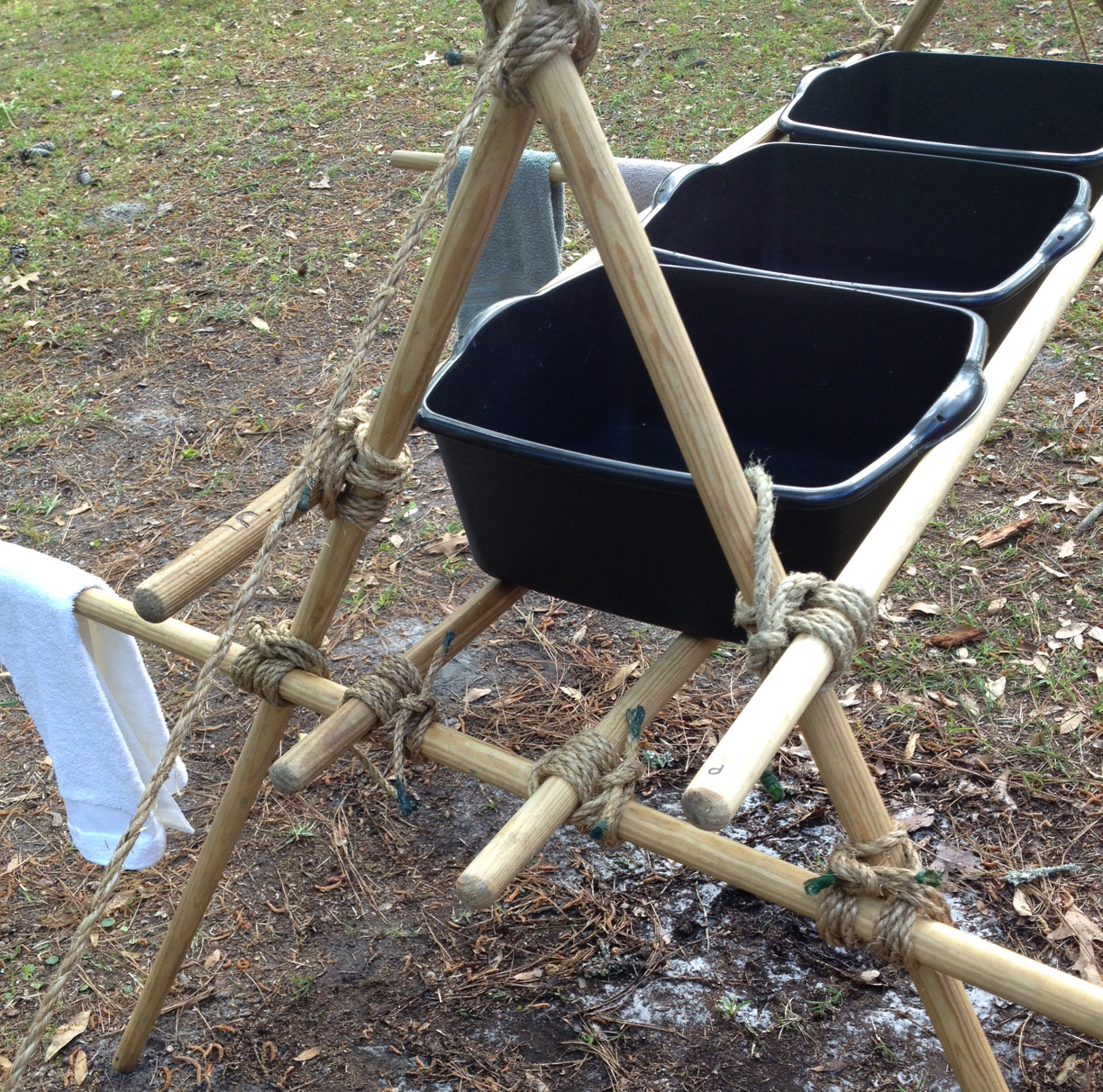 Two challenges. 1) Drawings for dish washing rack designs are common. But, until you make one and try it with full containers of water, it’s difficult to realize what the main challenge really is—to keep the containers from crashing down because they’re too heavy! Depending on the containers used, an average wash basin won’t have enough of a lip to hold it in place or is just too flimsy to keep it’s shape when filled with water. That’s why lashing together a framework alone usually won’t suffice. Therefore, in addition to the framework, this design includes a bottom platform made up of two Scout Staves for the basins to rest upon, which solves the weight issue. 2) The next challenge is one that’s common to many a pioneering structure, be it large or small. How do we keep the rack itself from falling over? We overcome this basic concern by bringing into play the same stability solution used in making a simple camp table. It’s exactly the same concept that keeps a Double A-Frame Monkey Bridge erect. Like the table, we connect two upright A-frames with a rope, and using the same rope, we anchor them securely in place on either side. Here’s what you’ll need:
