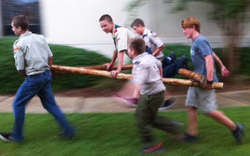 Chariot races are fun and here’s about the easiest version around. Once Scouts are familiar with the shear lashing and square lashing, they can make an A-Frame to serve as a simple carrying structure (chariot). The race can be run in a variety of ways: