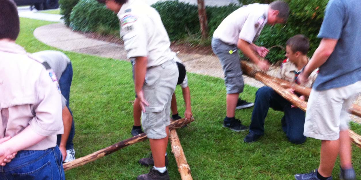 Four Scouts to serve as “Lifters” to lift the top 6′ support spar that’s on the ground. Their job is to first left and then push the tower up.